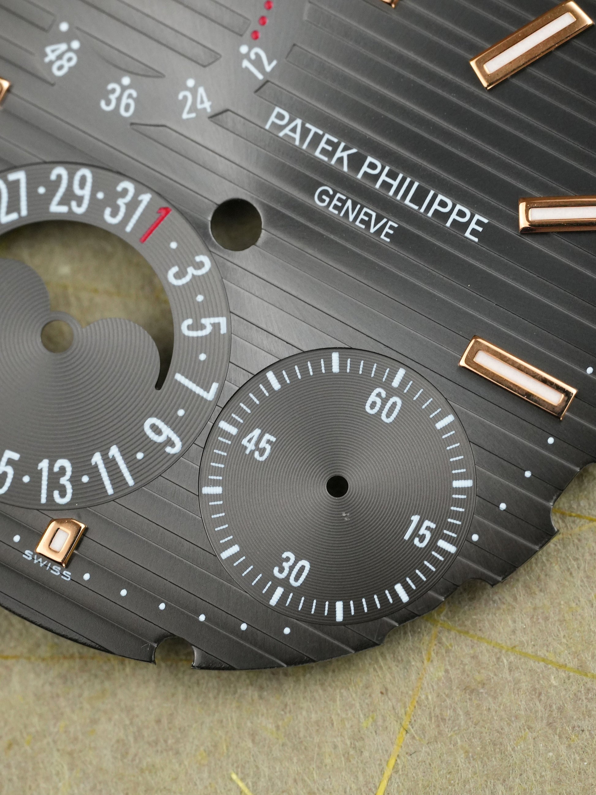 For sale is an original “Grey Dial” gray dial for the Patek Philippe Nautilus 5712R. The dial is in very good condition - there are only two small paint flaws to mention: one on the lower right totalizer and one in the area of the power reserve indicator at the top, but hardly or not at all visible when installed.