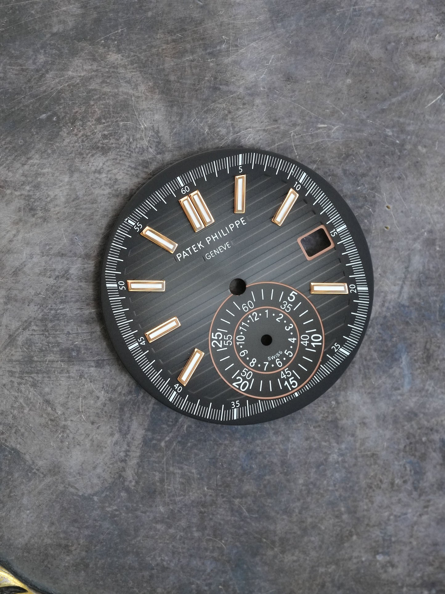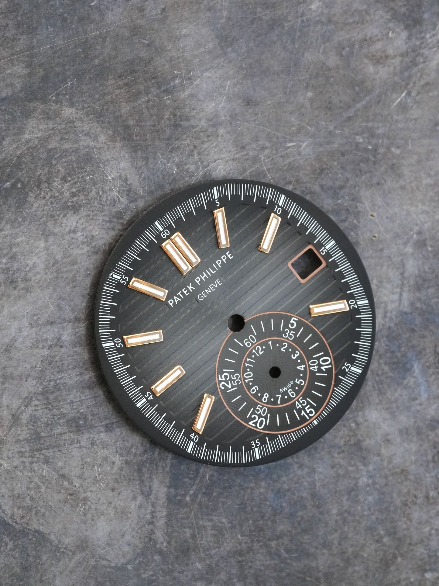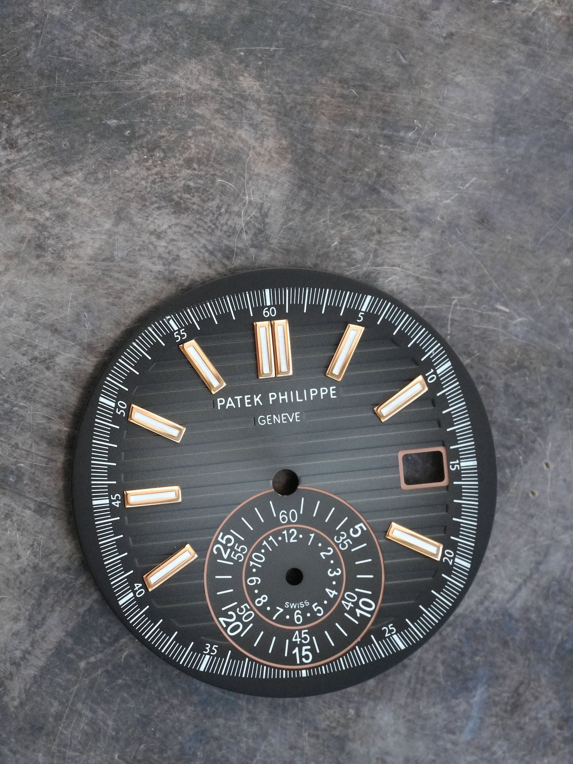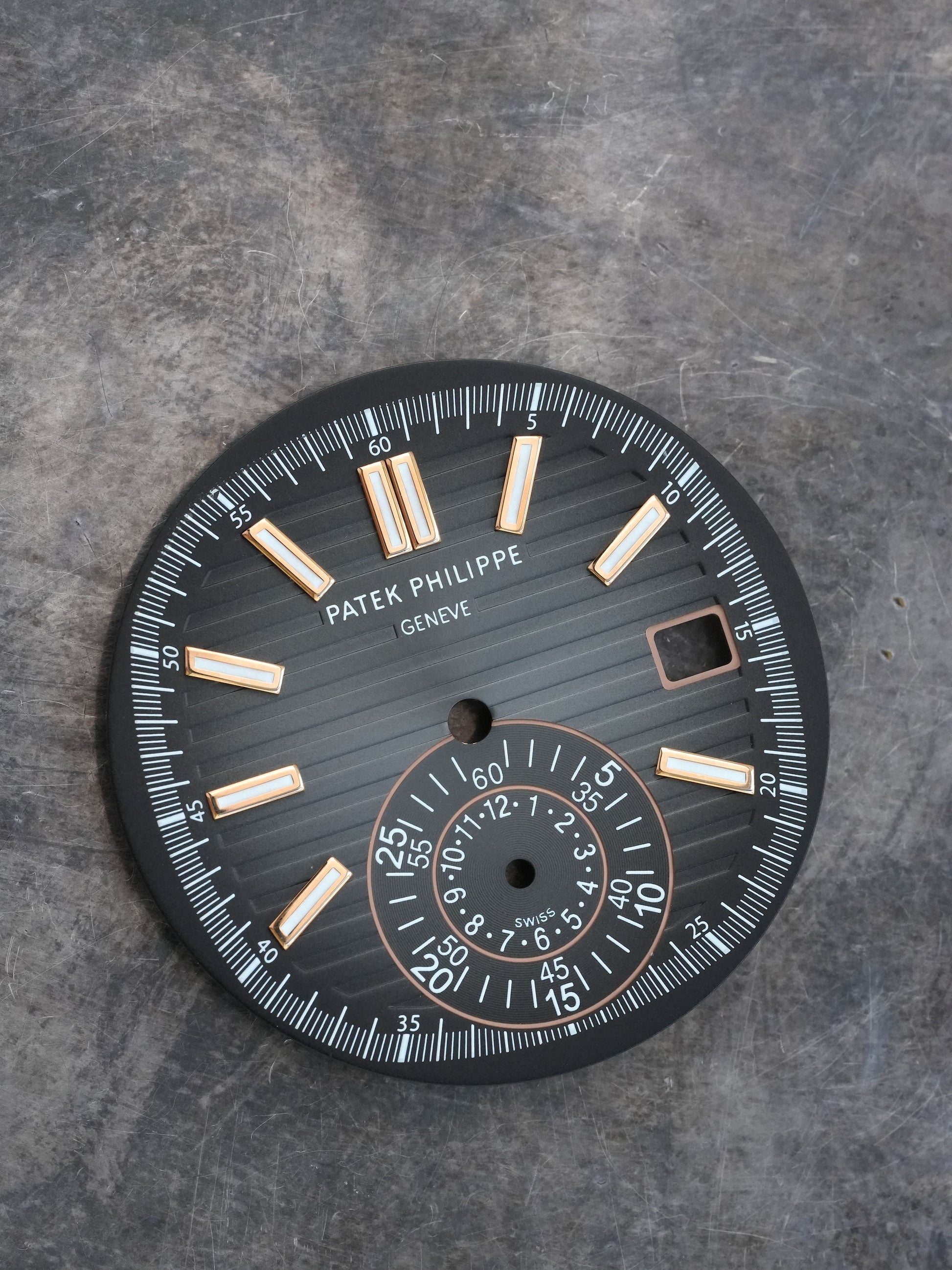 Original Patek Philippe black dial for the Nautilus 5980/1R in rose gold. The dial is in excellent overall condition, with only a small flake visible at the minute track near “55.” The surface is flawless otherwise, and both dial feet are fully intact.