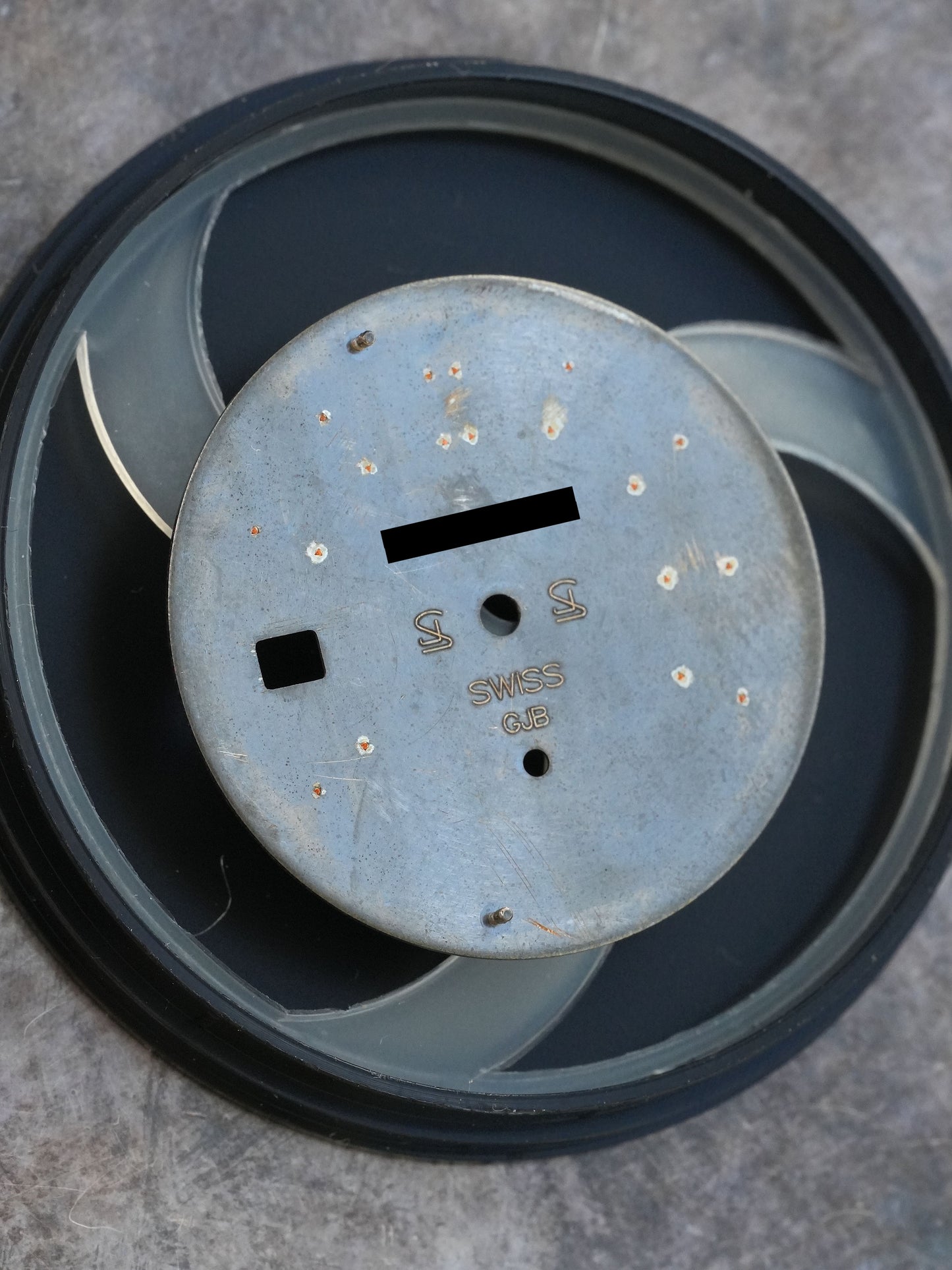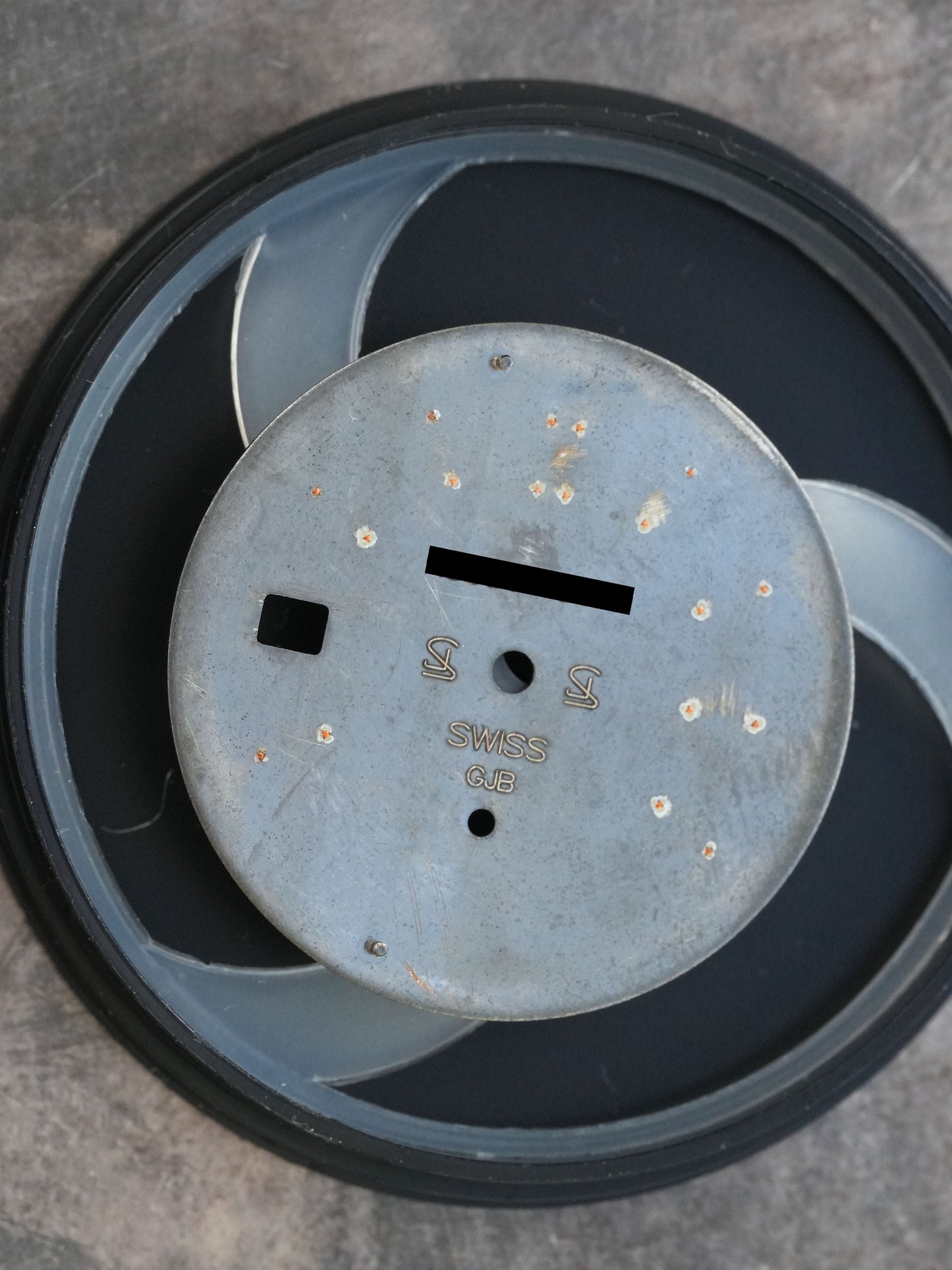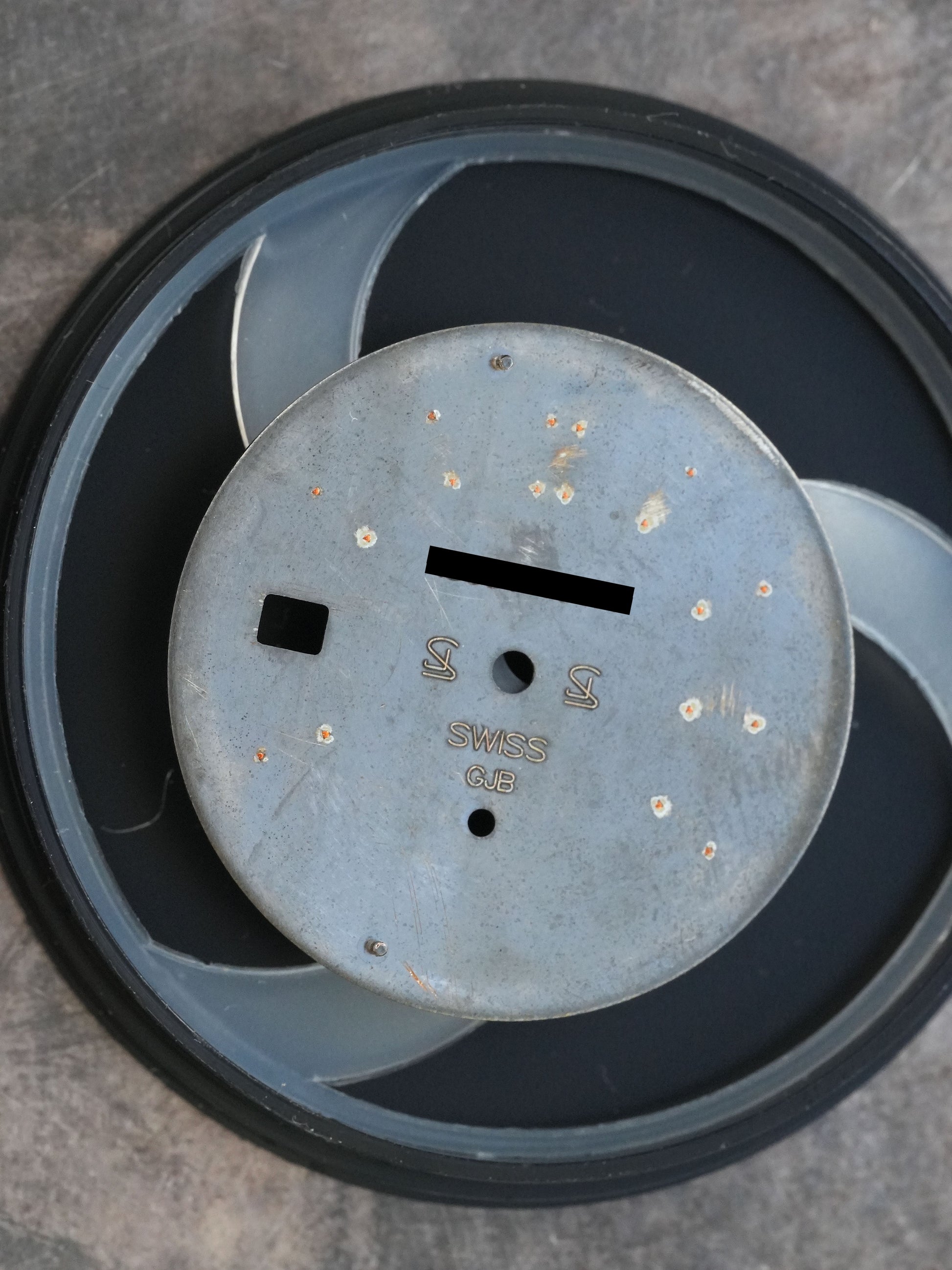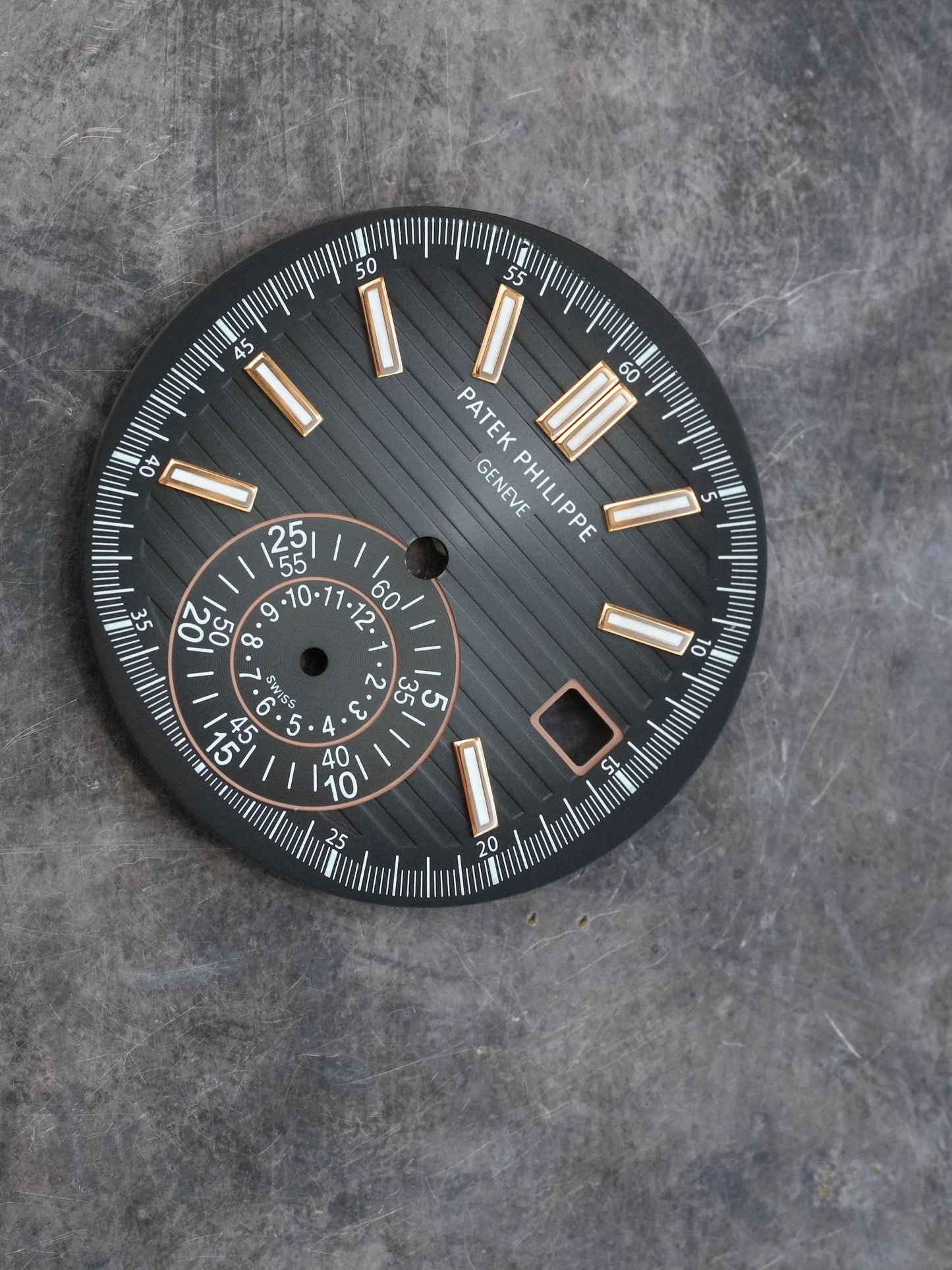 Original Patek Philippe black dial for the Nautilus 5980/1R in rose gold. The dial is in excellent overall condition, with only a small flake visible at the minute track near “55.” The surface is flawless otherwise, and both dial feet are fully intact.