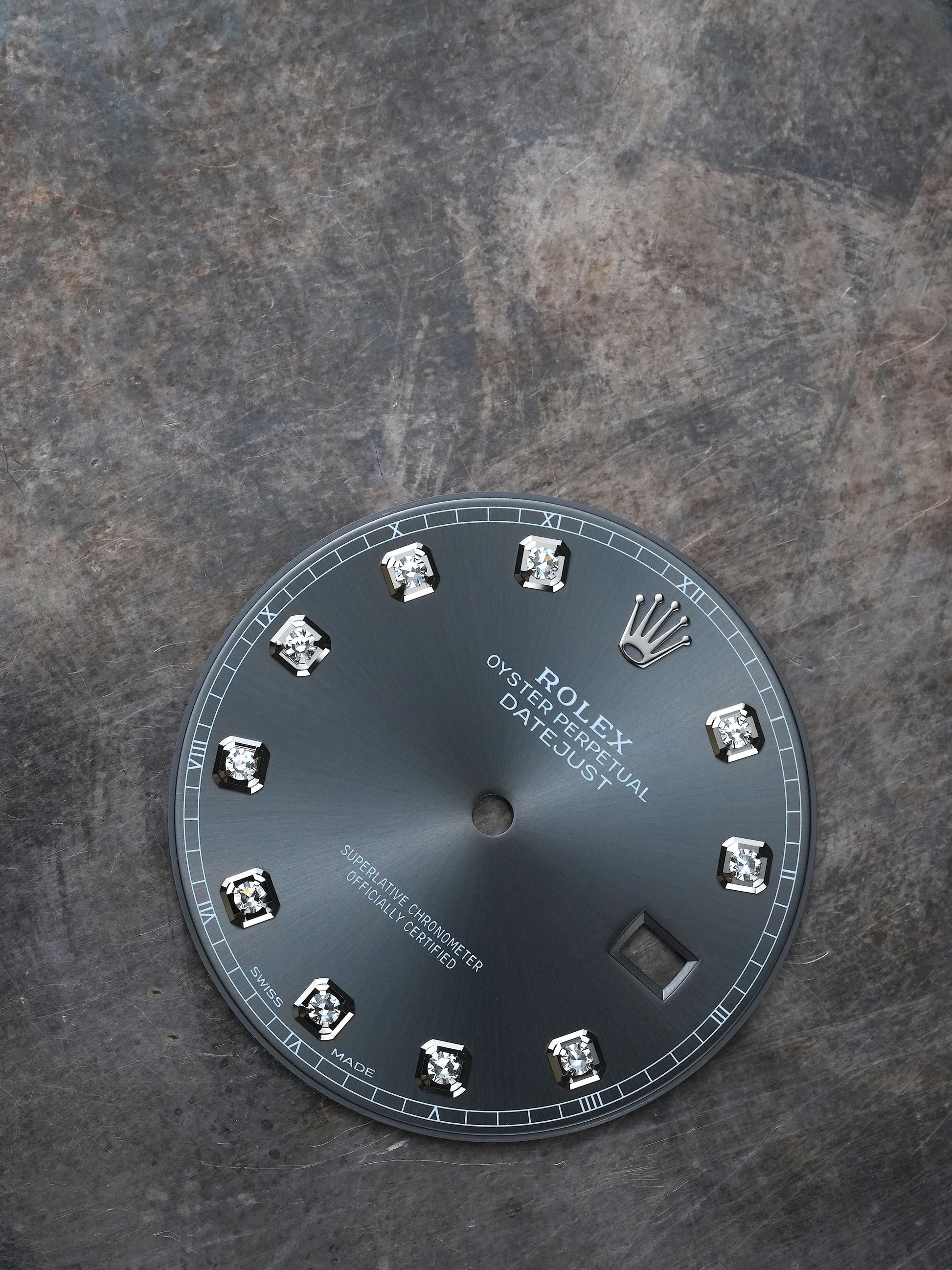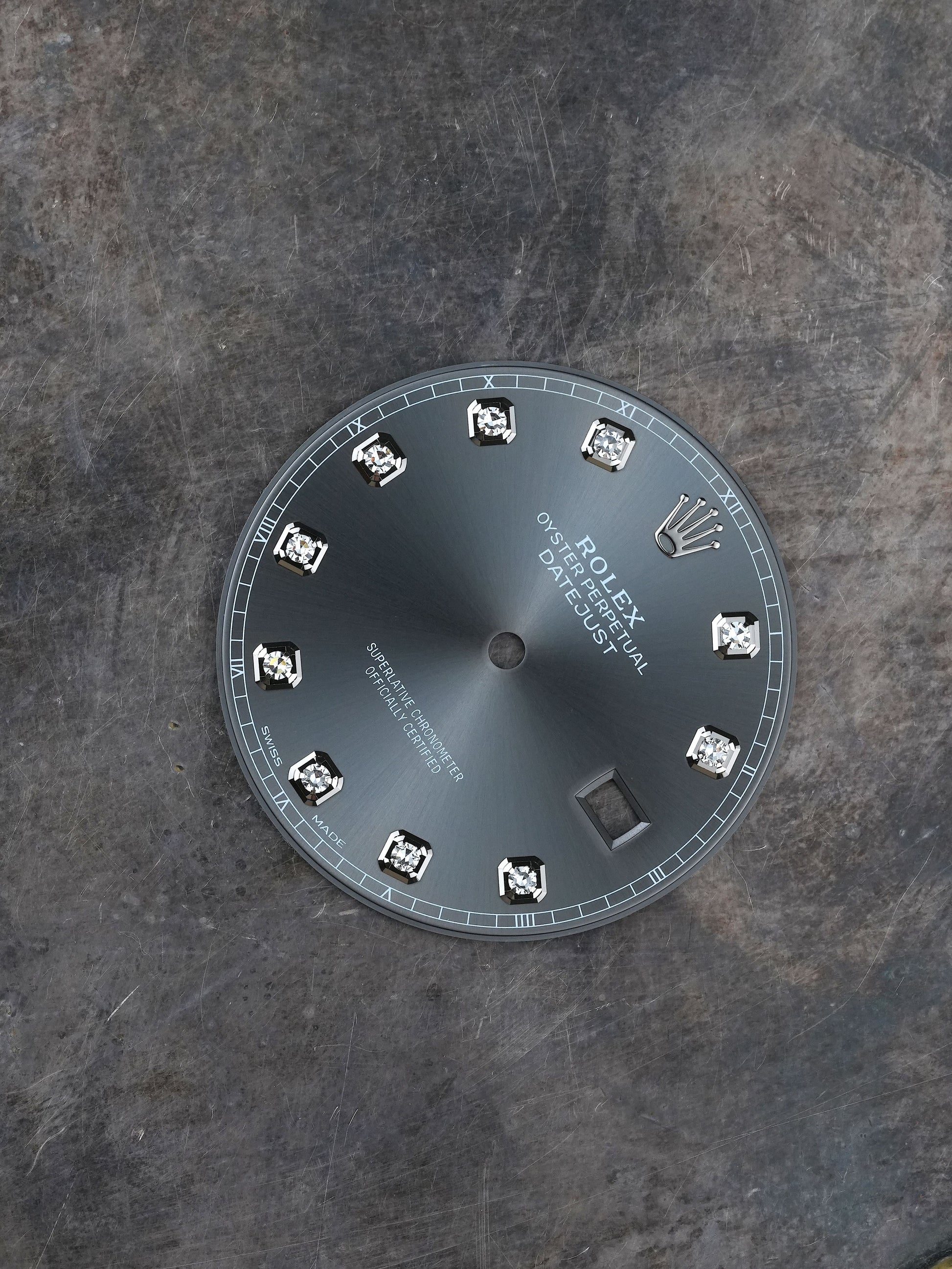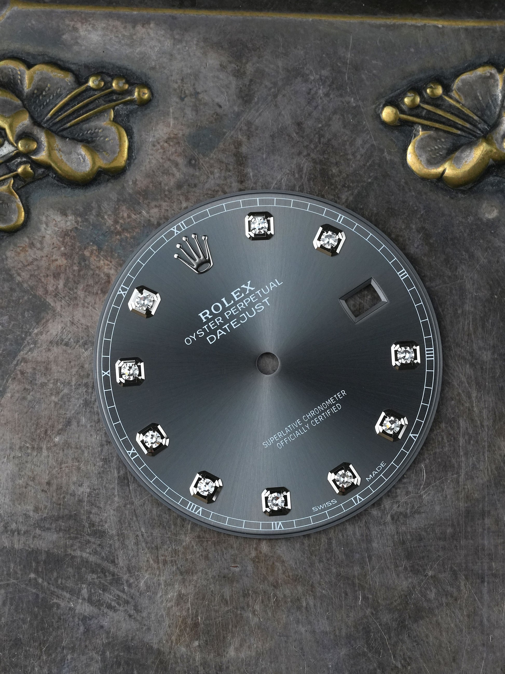 Original Rolex dial with diamond hour markers in grey is in excellent, near-mint condition.