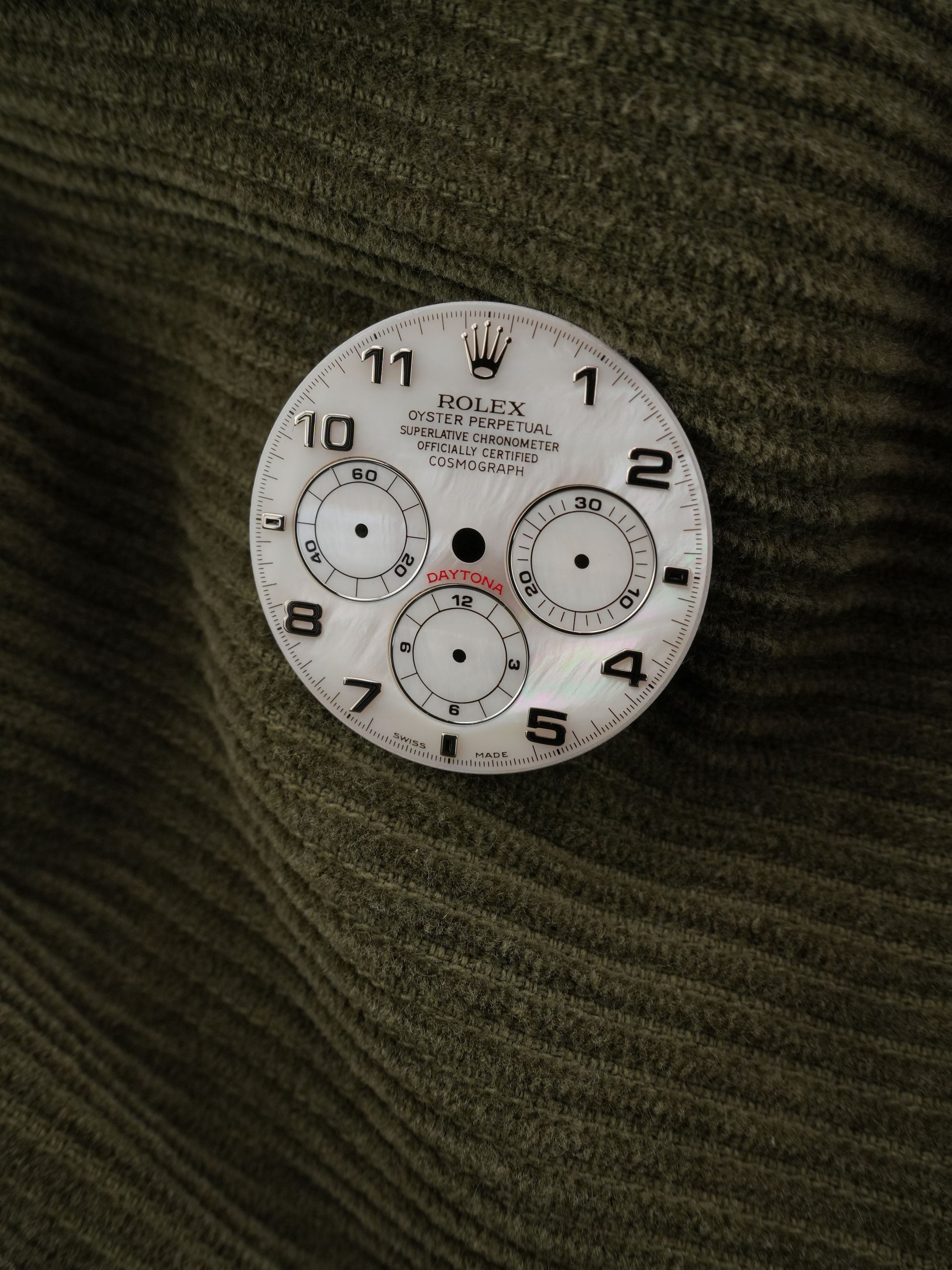 Rolex “MOP Mother of Pearl” White Ramon dial including hands for Cosmograph Zenith Daytona (reference 16519). Highly sought-after, beautiful mother-of-pearl dial with matching hands. Perfect condition. Price on request.